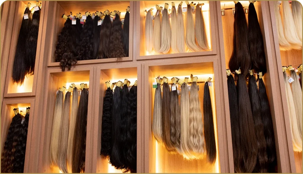 Cabelos humanos selecionados e tonalizados à mão, com brilho e textura personalizados.